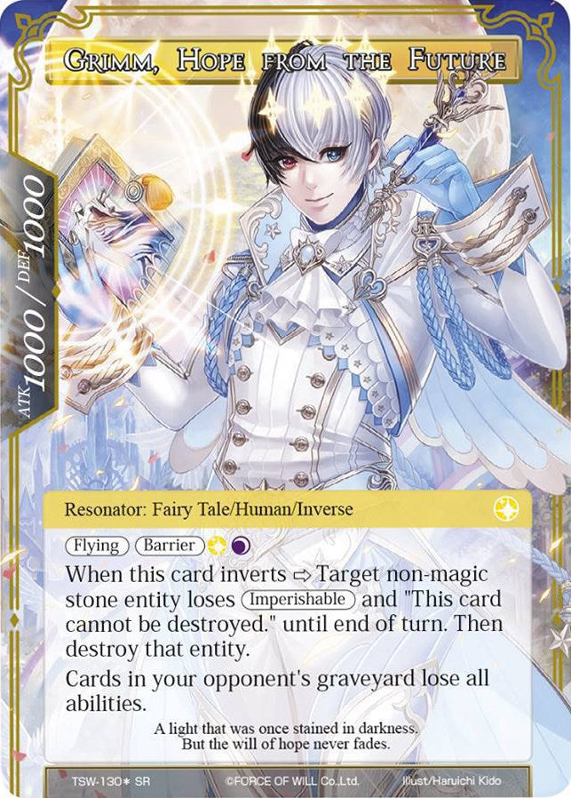 Grimm of the Crimson Moon [Flying] [Barrier] WB When this card enters the field -> Reveal any number of Fairy Tale resonators from your hand. Put a [+100/+100] counter on this card for each card revealed this way. Whenever this card attacks -> Put two mystery counters on your J/ruler. Whenever you do judgment of a ruler -> You may remove two mystery counters from your J/ruler. If you do, invert this card. Grimm, Hope from the Future [Flying] [Barrier] WB When this card inverts -> Target non-magic stone entity loses Imperishable and "This card cannot be destroyed." until end of turn. Then destroy that entity. Cards in your opponent's graveyard lose all abilities.