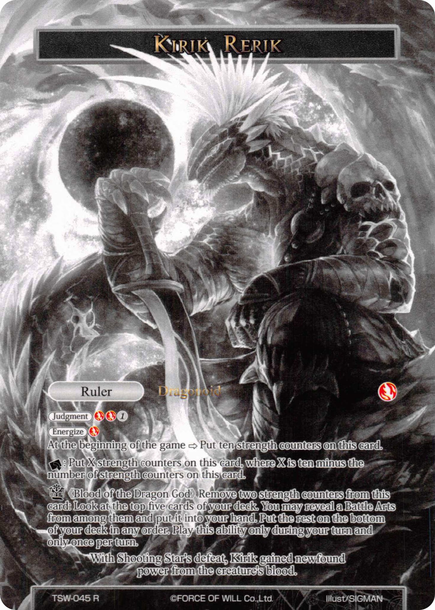 Sealed Item (Blood of the Dragon God) God's Art "Dragon King's Descent" R, remove seven strength counters from this card: Look at the top seven cards of your deck. You may put a Dragon resonator from among them into the field. Put the rest in your graveyard. This card gains [+1000/+1000] until end of turn.