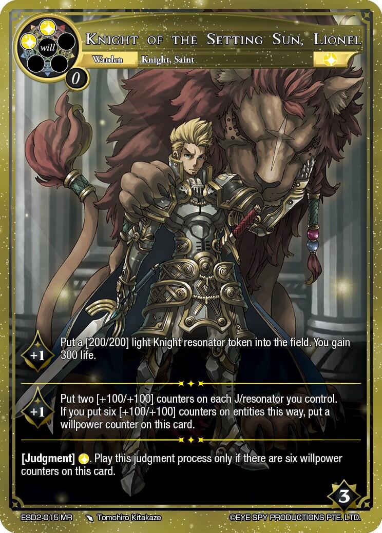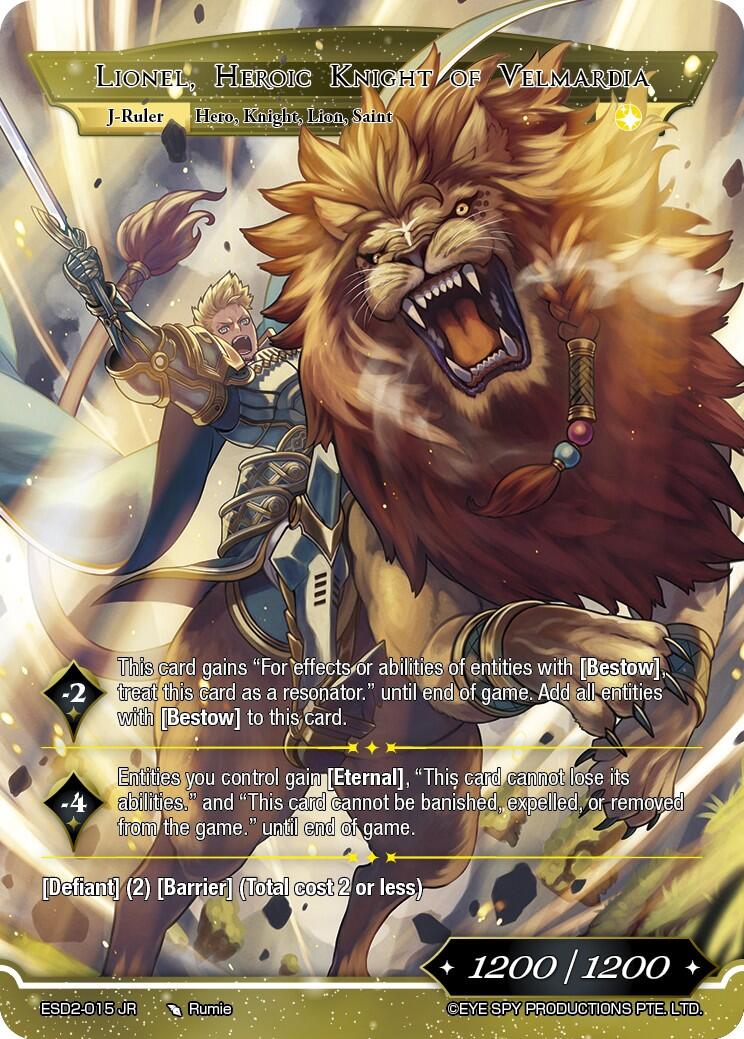 [+1] Put a [200/200] light Knight resonator token into the field. You gain 300 life. [+1] Put two [+100/+100] counters on each J/resonator you control. If you put six [+100/+100] counters on entities this way, put a willpower counter on this card. [Judgment]. Play this judgment process only if there are six willpower counters on this card. Lionel, Heroic Knight of Velmardia [-2] This card gains "For effects or abilities of entities with [Bestow], treat this card as a resonator." until end of game. Add all entities with [Bestow] to this card. [-4] Entities you control gain [Eternal], "This card cannot lose its abilities." and "This card cannot be banished, expelled, or removed from the game." until end of game. [Defiant] (2) [Barrier) (Total cost 2 or less)