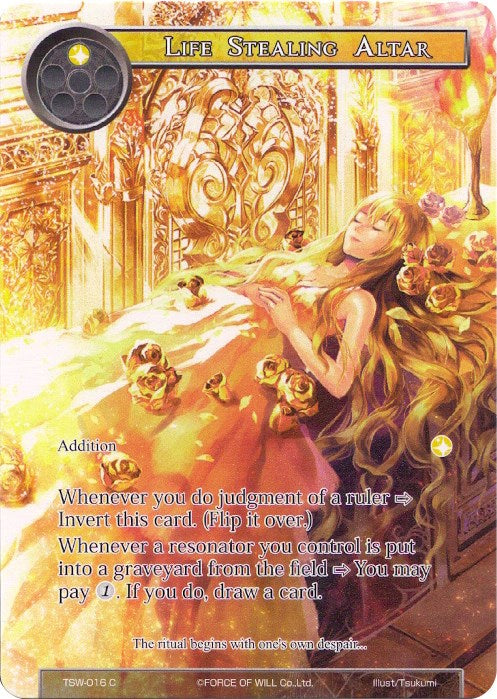 Life Stealing Altar Whenever you do judgment of a ruler -> Invert this card. (Flip it over.) Whenever a resonator you control is put into a graveyard from the field -> You may pay 1. If you do, draw a card. Soul Returning Altar When this card inverts -> Put the top card of your magic stone deck into the field rested. Banish a resonator: Target resonator gains [-400/-400] until end of turn.
