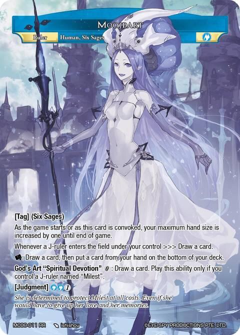 [Tag] (Six Sages) As the game starts or as this card is convoked, your maximum hand size is increased by one until end of game. Whenever a J-ruler enters the field under your control >>> Draw a card. [Rest]: Draw a card, then put a card from your hand on the bottom of your deck. God's Art "Spiritual Devotion" 0: Draw a card. Play this ability only if you control a J-ruler named "Milest". [Judgment] UU1 J-ruler [Flying] This card gains [+300/0] for each card in your hand. Whenever this card deals damage to your opponent >>> Draw a card.