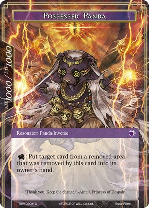 Panda Medium Whenever you do judgment of a ruler -> Invert this card. Rest: Remove target card in your graveyard from the game. Possessed Panda Rest: Put target card from a removed area that was removed by this card into its owner's hand.