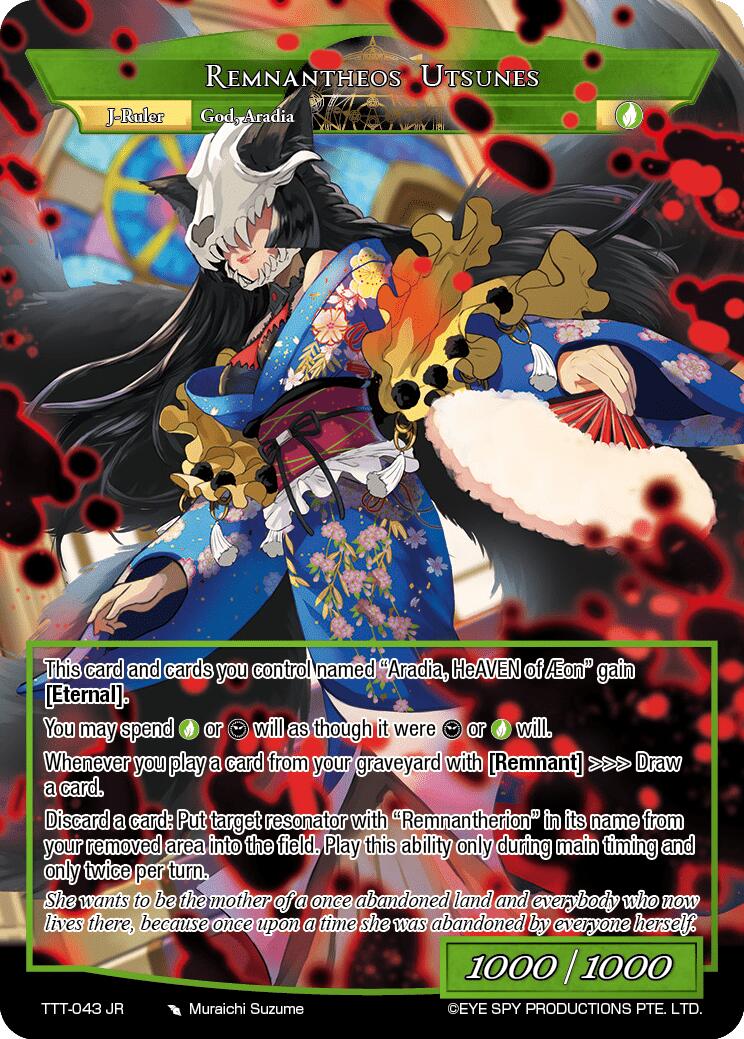 Cards you control named "Aradia, HeAVEN of Æon" gain [Eternal]. You may spend G or T will as though it were T or G will. Whenever you play a card from your graveyard with [Remnant] Draw a card. [Judgment] GGGTTT. You pay GT less to play this judgment process for each resonator with "Remnantherion" in their name and with different names among expelled cards you own outside the game. Remnantheos Utsunes This card and cards you control named "Aradia, HeAVEN of Æon" gain [Eternal]. You may spend G or T will as though it were or will. Whenever you play a card from your graveyard with [Remnant] Draw a card. Discard a card: Put target resonator with "Remnantherion" in its name from your removed area into the field. Play this ability only during main timing and only twice per turn.