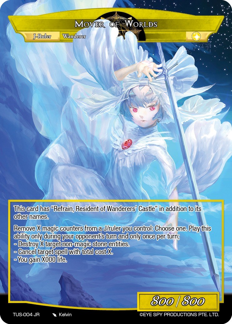 [Quickcast] Choose one: - Recover a light or wind J/ruler you control. Draw a card. - You may contract this card with "Refrain, Resident of Wanderers' Castle". [Mastery] "Refrain, Resident of Wanderers' Castle" Mover of Worlds This card has "Refrain, Resident of Wanderers' Castle" in addition to its other names. Remove X magic counters from a J/ruler you control: Choose one. Play this ability only during your opponent's turn and only once per turn; - Destroy X target non-magic stone entities. - Cancel target spell with total cost X. - You gain X00 life.